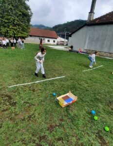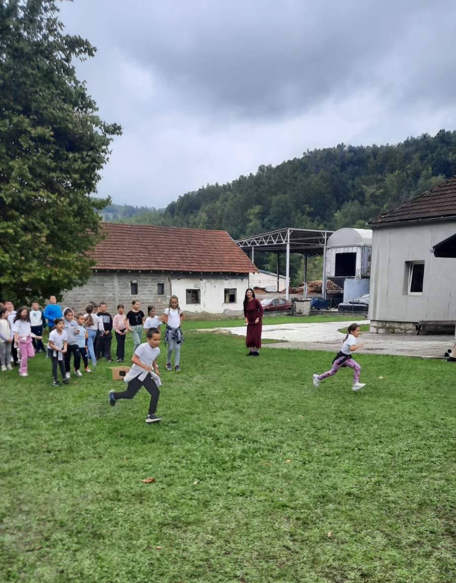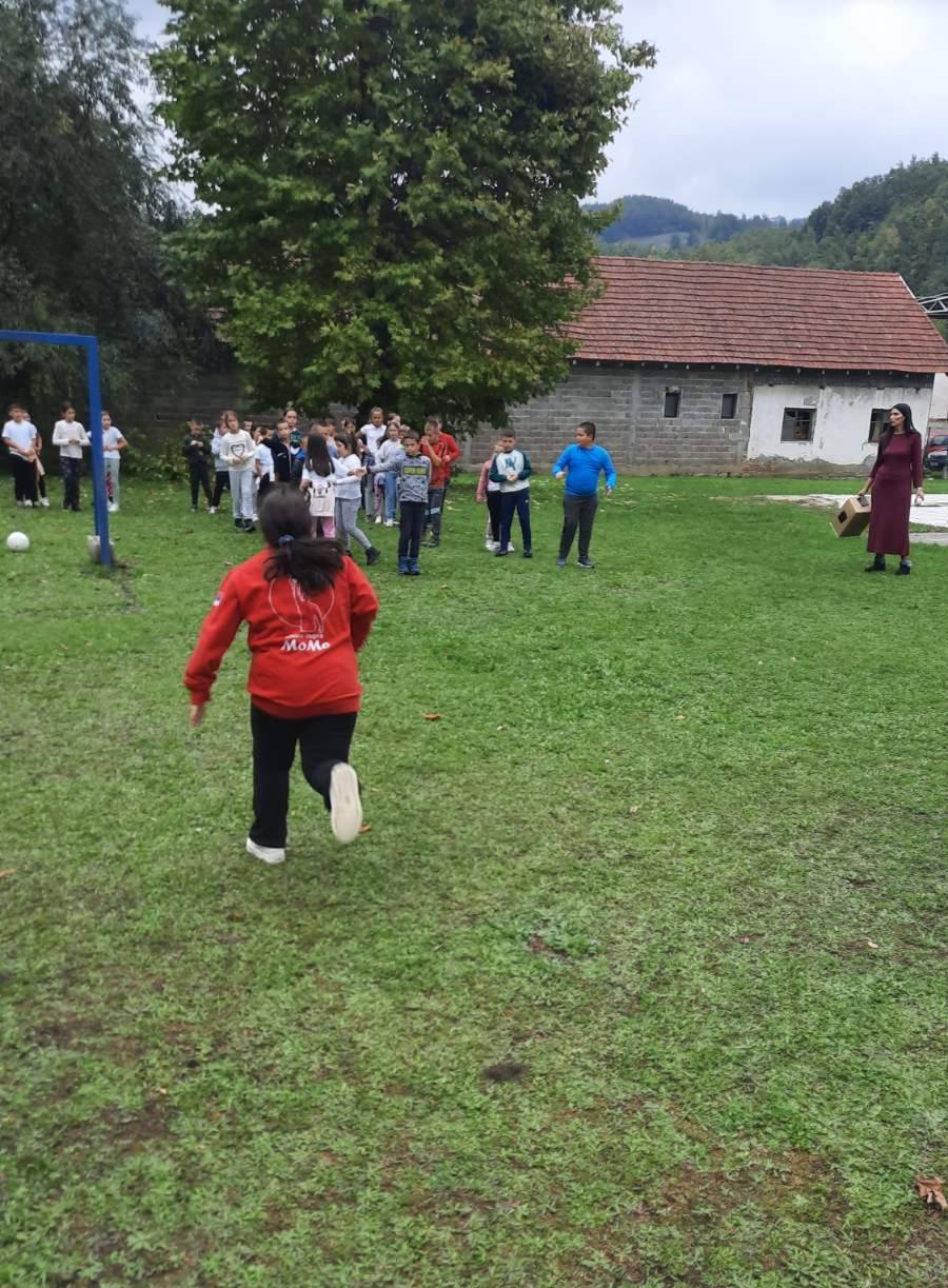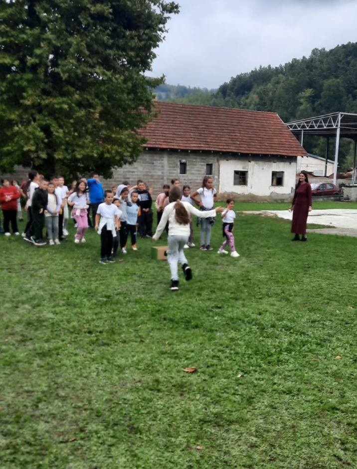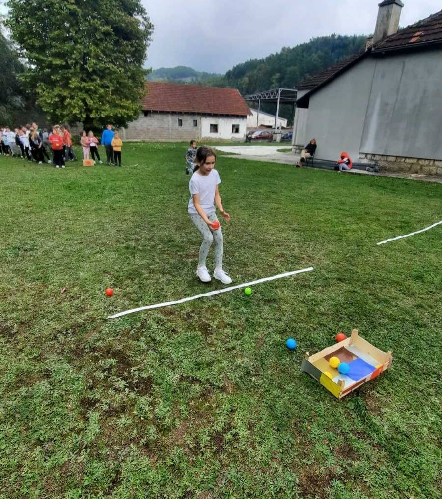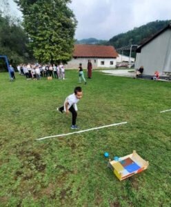 Након креативног рада, ученици су у школском дворишту имали спортске активности. Подељени у две екипе, такмичили су се у трчању, прелажењу препрека и убацивању лоптица у кутије. Затим су дечаци играли фудбал, а девојчице су кредама у боји цртале мотиве по жељи и тако украсиле тротоар испред школе.