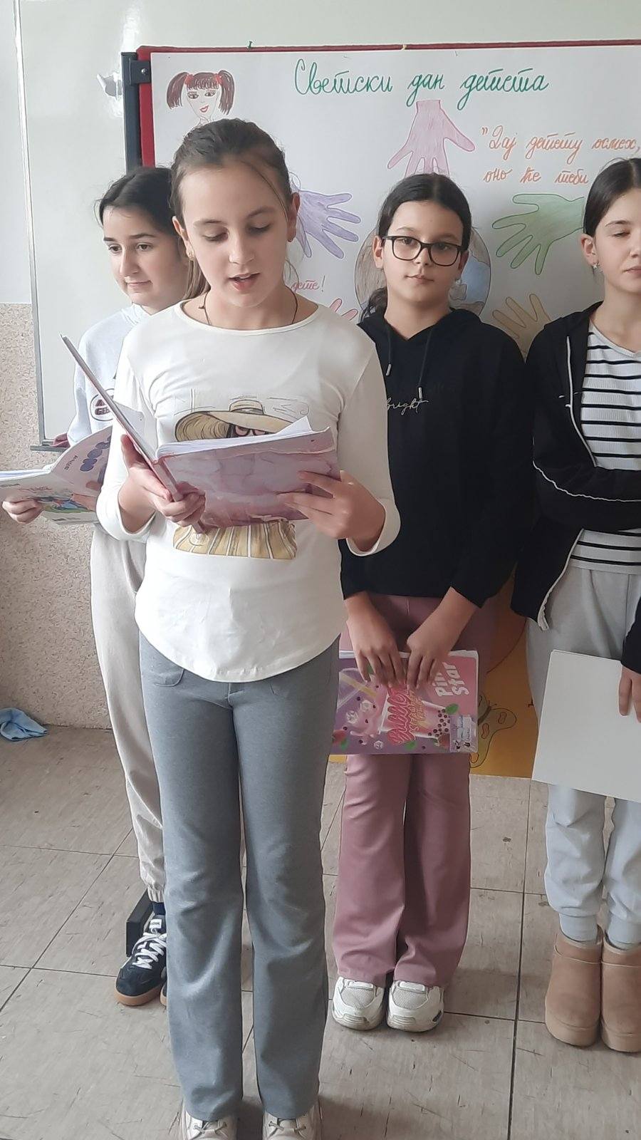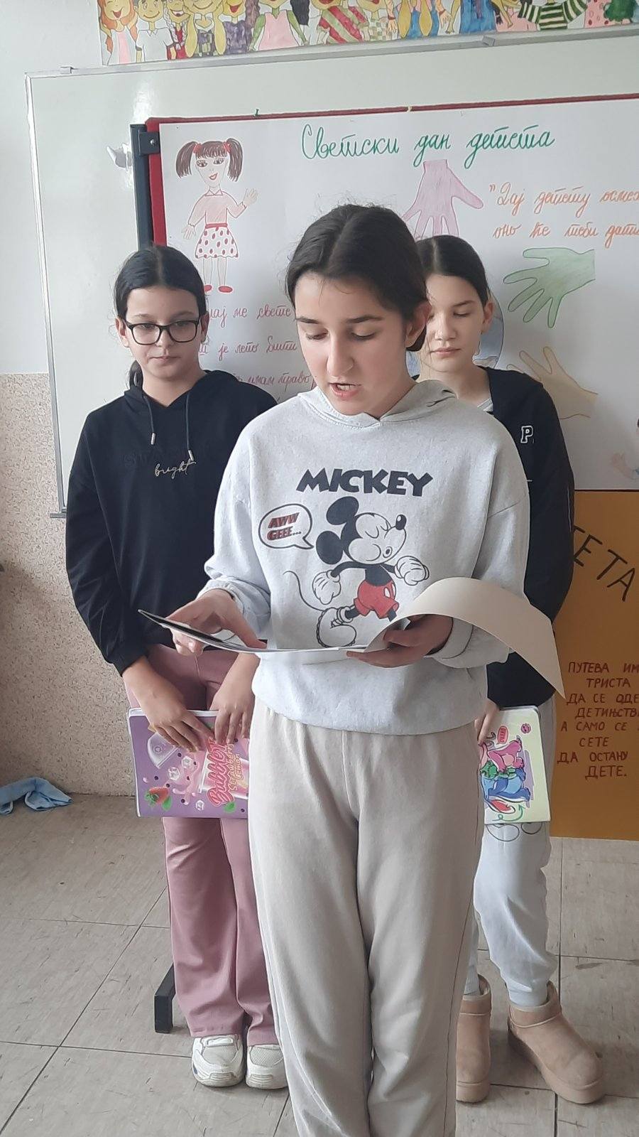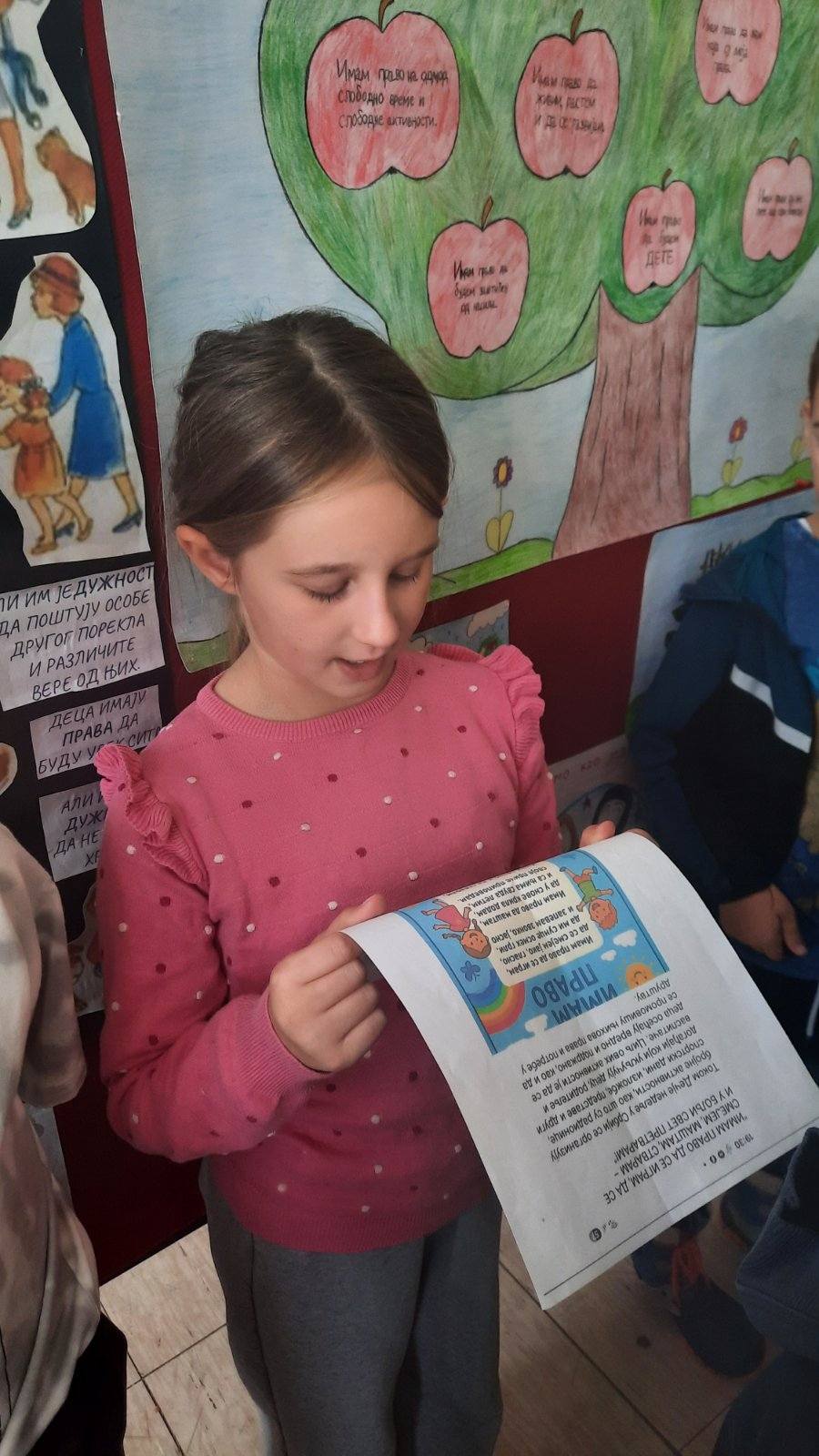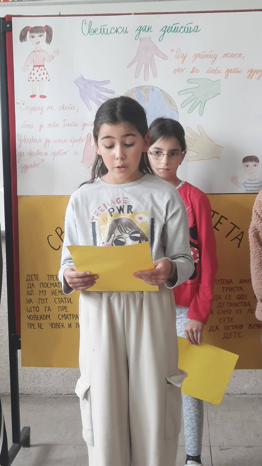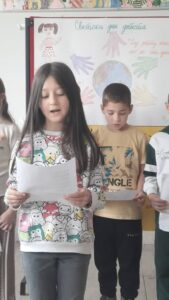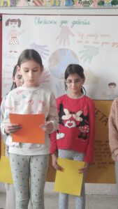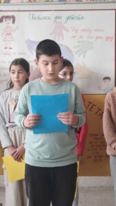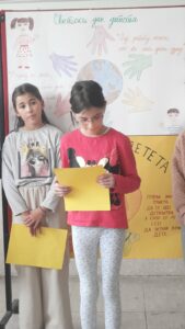 На самом почетку пожелели смо нашим драгим првацима срећан пријем у Дечји савез и полазак једне нове ученице у први разред. Након тога смо представили овогодишњи слоган којим ћемо обележити Дечју недељу “Имам право да се играм, да се смејем, маштам, стварам – и у бољи свет претварам”.