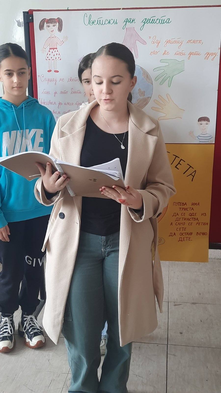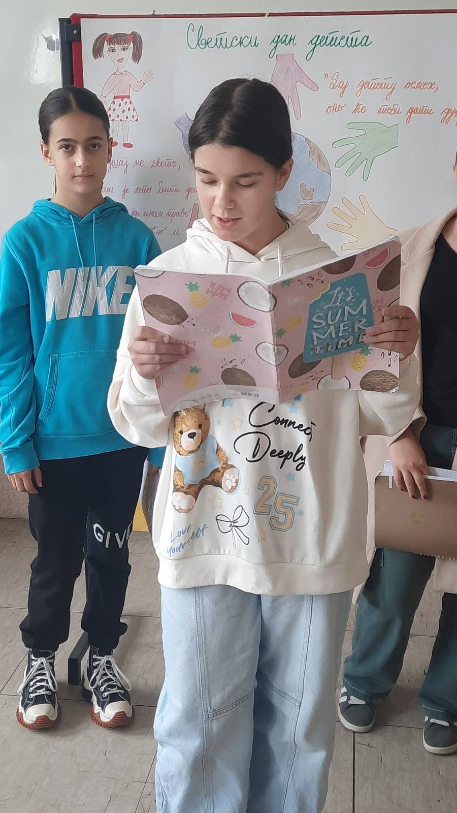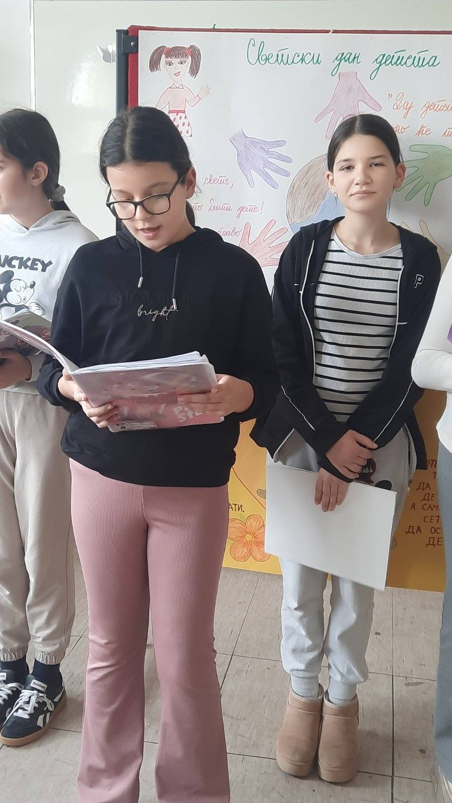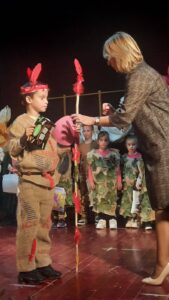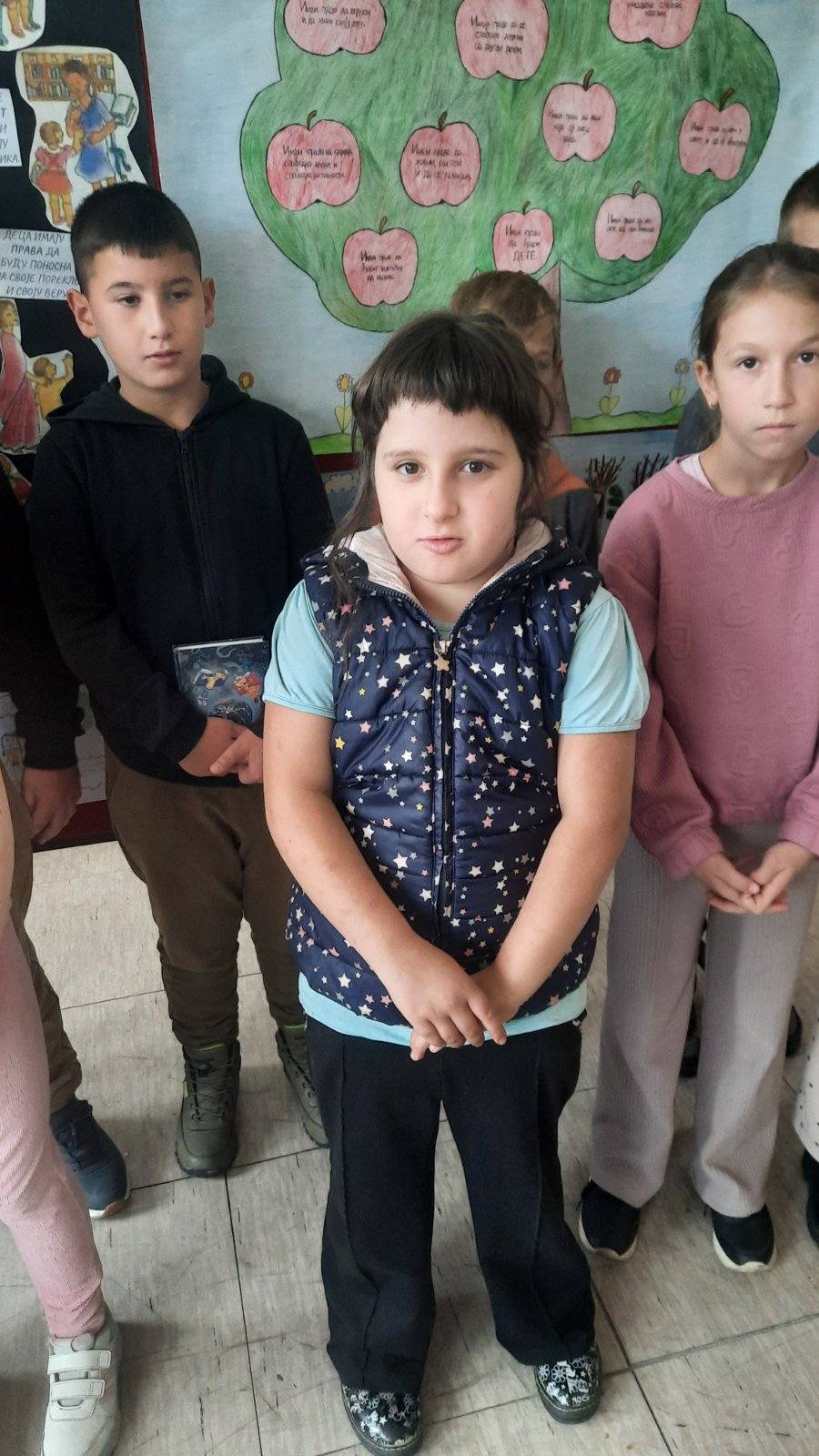 На самом почетку пожелели смо нашим драгим првацима срећан пријем у Дечји савез и полазак једне нове ученице у први разред. Након тога смо представили овогодишњи слоган којим ћемо обележити Дечју недељу “Имам право да се играм, да се смејем, маштам, стварам – и у бољи свет претварам”.