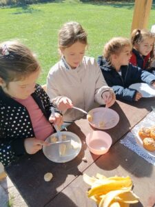 У ИО у Вучковици ученици су донели припремљену проју и бакин колач, читали су о свим старим јелима, а затим су заједно са другарима из вртића решавали загонетке о воћу и поврћу, правили воћну салату и уживали у здравој храни.